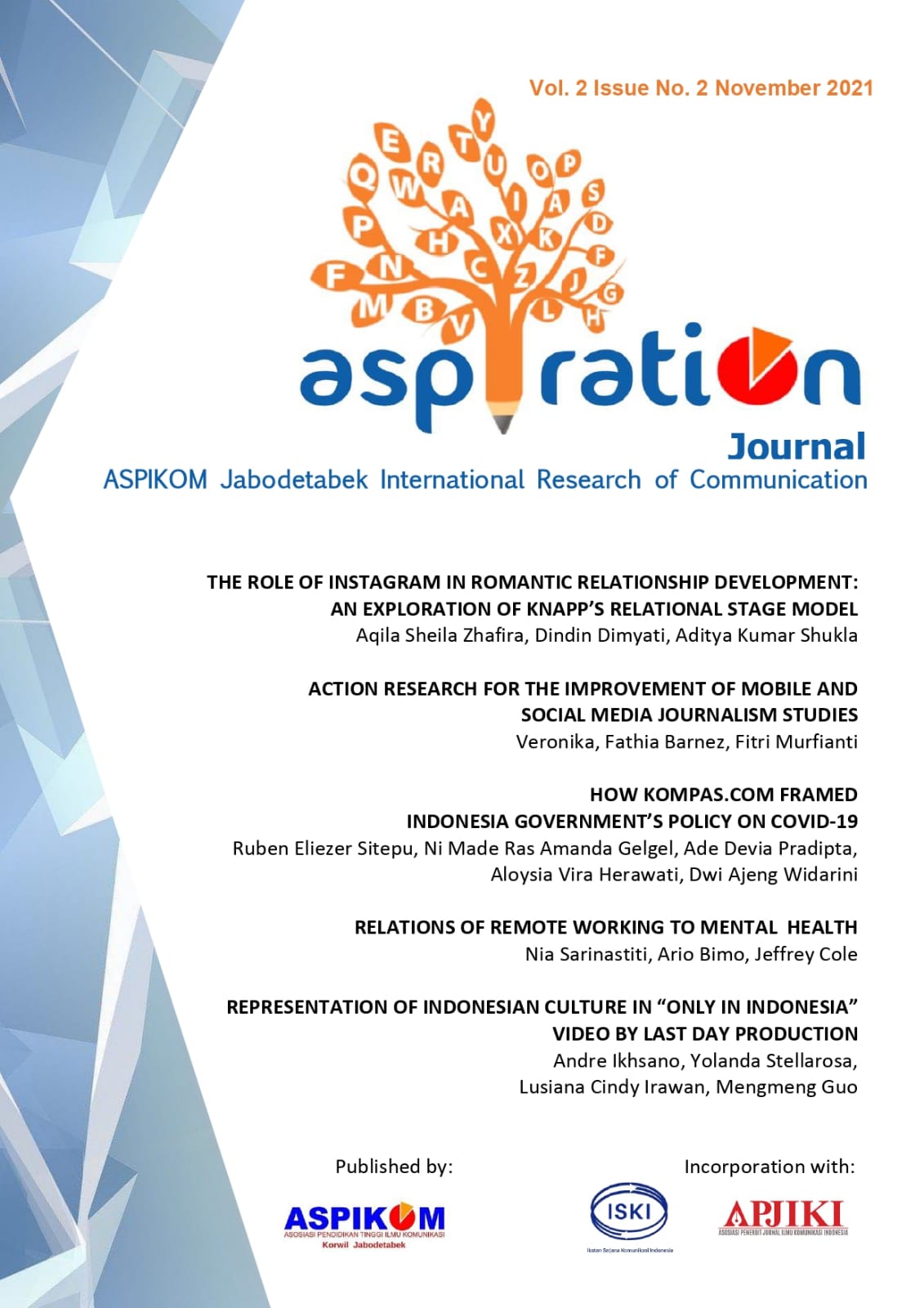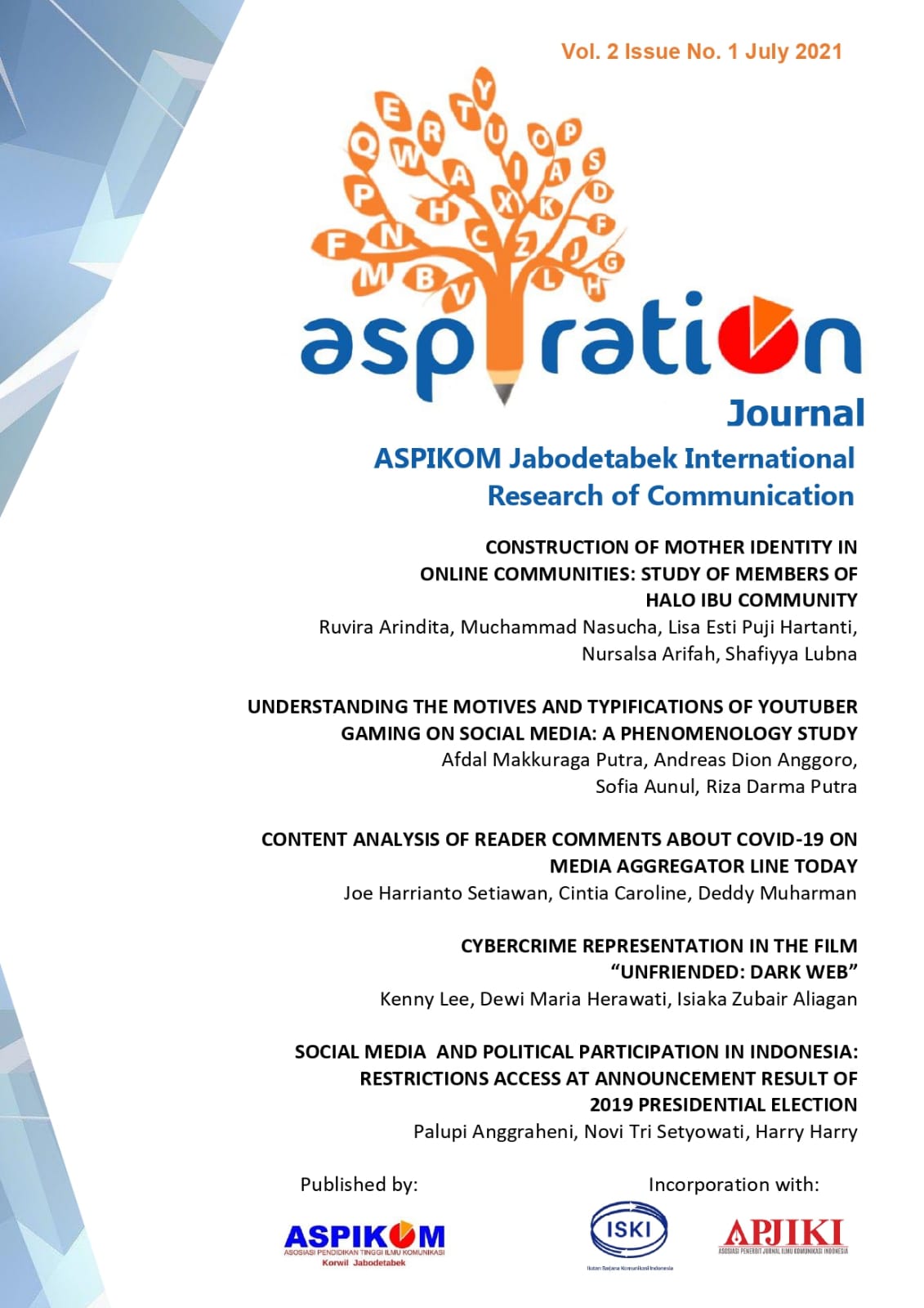"ASPIRATION" is an acronym for ASPIKOM Jabodetabek International Research of Communication. ASPIRATION Journal published by ASPIKOM Jakarta, Bogor, Depok, Tangerang, and Bekasi Regions supports the mission of ASPIKOM (Communication Science in Higher Education Association), especially intending to develop communication through participation and collaboration from researchers and practitioners with scientific works that altogether able to develop a comprehensive communication science traditions with a broader perspective. We expect work that addresses the current problem in the national and international context.